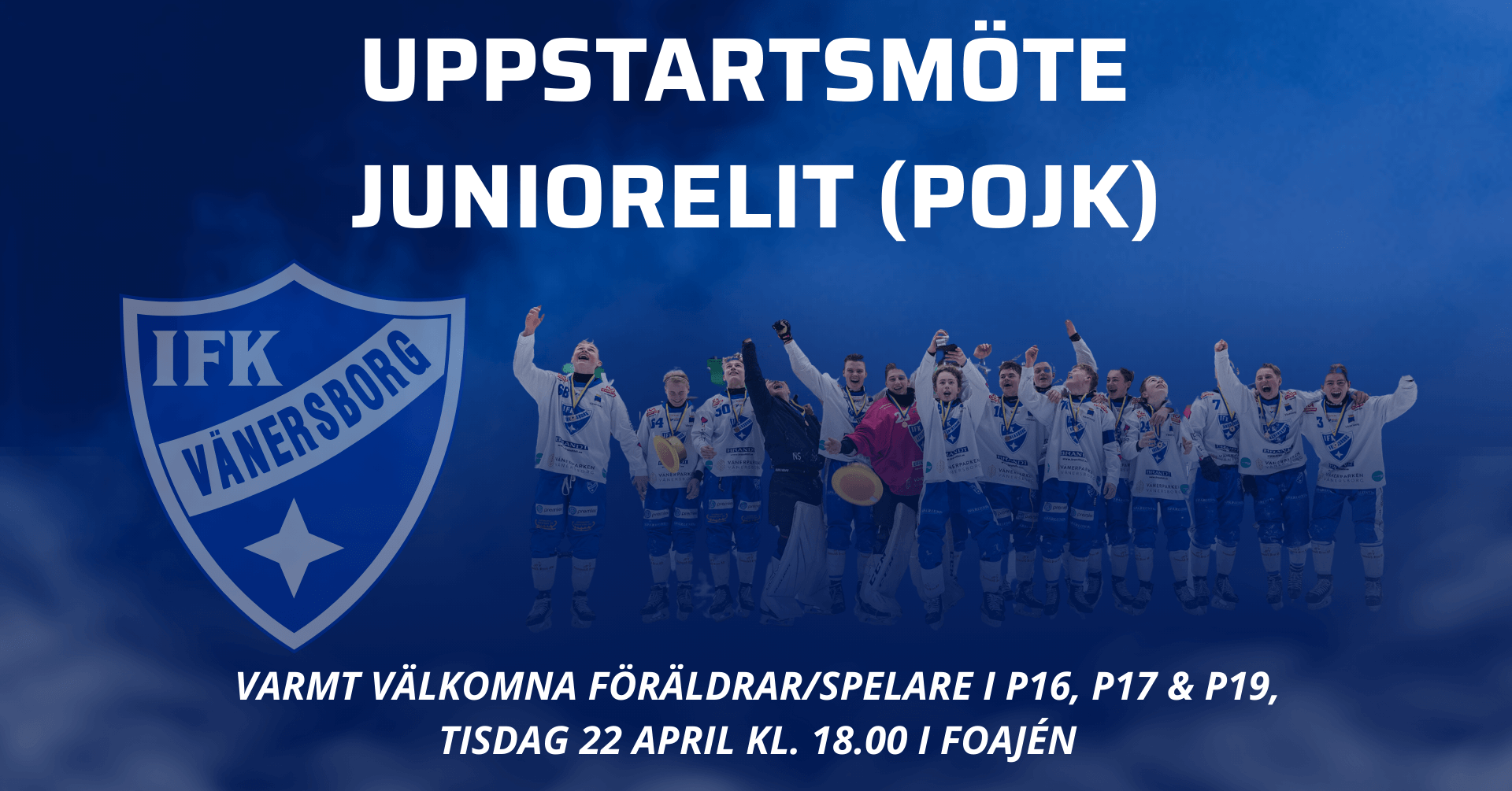 Tisdag 22 april kl. 18.00 bjuder IFK Vänersborg in till upptaktsträff för spelare/föräldrar i P16/P17 Regional, P17 Nationell och P19 Nationell. Det kommer presenteras ett upplägg för försäsongen, vilka lag vi kommer ha inom juniorelit på pojksidan säsong 2025/2026, ledare, vad det innebär att tillhöra juniorsektionen i IFK Vänersborg, vilka förutsättningar spelarna har, med mera.